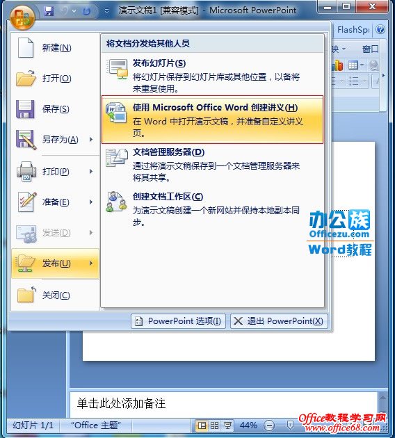 学会使用office各个组件间的协同作业不仅仅可以大大提高您的工作效率,还会让您有一种酣畅淋漓的快感。本系列文章将从一个个实例出发,为大家演示如何将Office家族的成员都发动起来, 满足不同的办公要求。 Word与PowerPoint的亲密接触—将幻灯片直接导入Word 对于很多朋友来说,把PowerPoint中的幻灯片导出,是最常见任务了。如果需要打印,可以选择打印讲义的方法将幻灯片每页不同的数目打印。但是您有没有想过,如果把幻灯片内容导入Word进行编辑该如何进行呢?这一定会方便很多基于幻灯片进行评论或者出版的用户。 操作步骤PowerPoint与Word有很好的兼容性。我们知道在一个演示文稿中有幻灯片主体,其中的内容叫做讲义,还有一项备注的内容,PowerPoint可以将它们按照需要导出到Word,这个功能可以依次选择“Office”按钮,“发布”—“使用Microsoft Office Word创建讲义”。