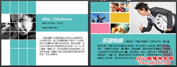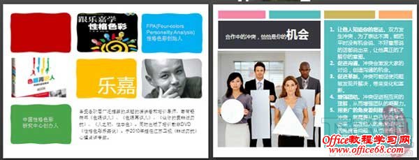 左图:喜欢看《非诚勿扰》,乐嘉言语的犀利是节目的最大亮点,喜欢他的FPA乐嘉性格色彩,买了他的两本书,正在学习。把页面等分成9份,红蓝黄绿四色“性格“配以其中,其他以图片填充。色块和图片的多少,随你的喜好组合吧。 右图:页面分成两部分,接近等分吧。图片可以在左边也可以在右边,怎么做你说了算。