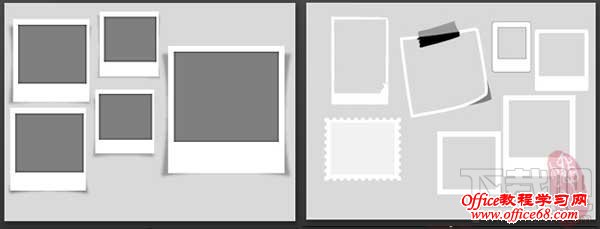 左图:给图片做些阴影效果,像极了我们记事本的便利贴,背景是个虚化的矩形边框,可以自行调节阴影的颜色和透明度。右图:胶带的效果还不错,也可以换成图钉之类的作为点缀,会有图片更加的活泼。平时可以多多积累些这样的效果备用,阴影的,邮票边框等,这样做起课件的时候也会比较的得心应手。