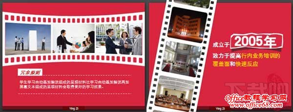 右图:这是给建行定制PPT课件的时候其中的一页,这页是讲建行的历史的,因此选择了胶片的效果,配以曾经的图片。客户觉得蛮神奇的,有时候稍微动下脑子,效果完全不一样。 4、格子罗列 这种方格子是的罗列,专业点叫“栅格系统”。大学的时候上过“栅格系统与平面设计”的理论课,不过老师讲的云里雾里,我们听的也就云山雾罩的。“栅格系统”过于专业,不过简单点就是把页面等分就好,配以相应的文字,效果还算干净整洁。