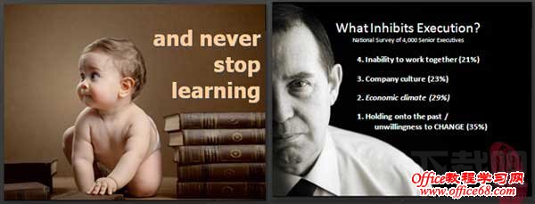 左图:拉一条渐变的矩形色块,调整矩形一边的透明度。如果有多张图片,随意罗列到一边,不需要刻意整齐。 右图:同样是画一条矩形,只是简单调整了矩形的透明度,隐约能看到底图。 6、全图型展示 全图型的展示就不罗嗦了,主要是品质高的符合课件主题的图片比较难找。这种主要是以图片为载体,配以文字。这样出来的效果视觉冲击力会比较强。好图难求,多积累吧。如果你对全图型图片展示感兴趣,看看lonelyfish的这篇“ 全图型PPT文字清晰化的优化技巧”讲的很细致。