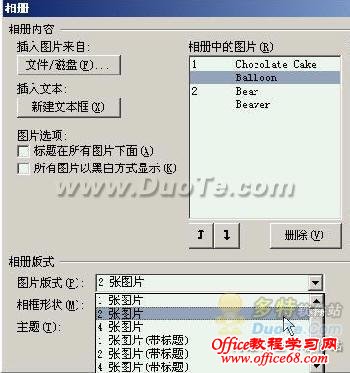 从电脑本机的文件夹中选择需要插入的相片。因为图片比较小,所以我们“图片版式”中选择“2张图片”,表示一页中插入两张图片。 “相册中的图片”标明了图片的文件名,下面的上下箭头按钮可以调整图片顺序,删除按钮帮助我们挑选图片。 “预览”图片下面的小图标还可以帮助我们对图片进行简单的旋转、调整对比度和亮度等处理。