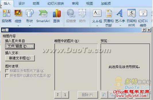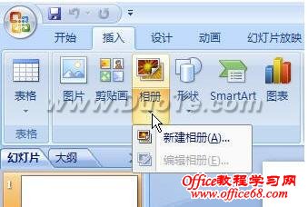 使用PowerPoint 2007的相册功能,我们可以很轻松地将自己的照片制作成带音乐的动态相册。下面就一起来试试吧! 在PowerPoint 2007的插入选项卡中点击“相册-新建相册”。