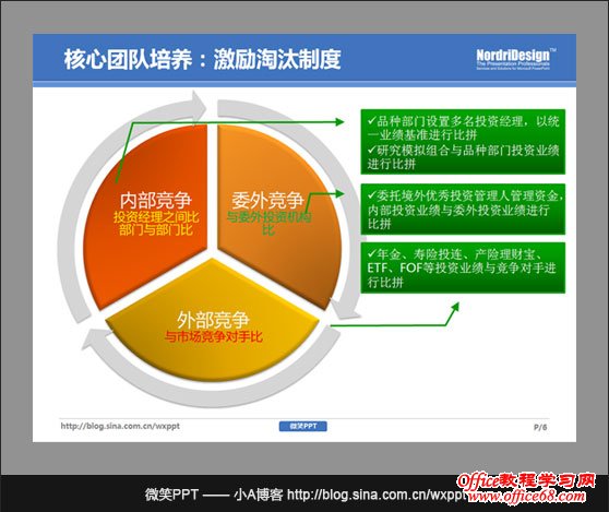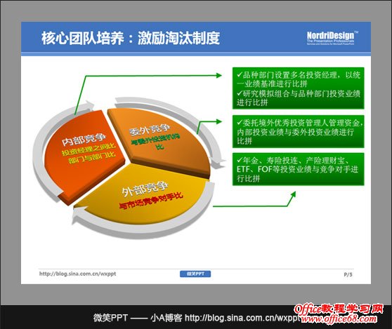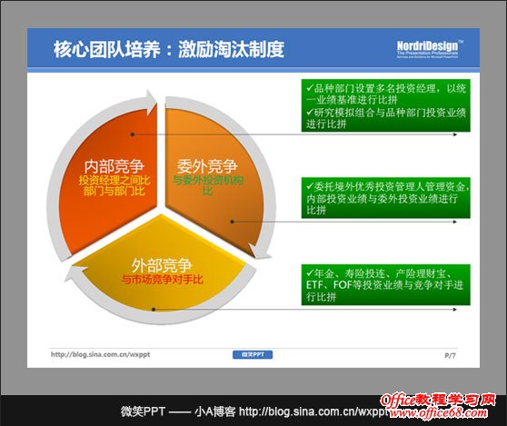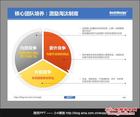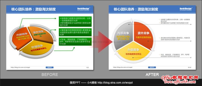 很长时间都没有更新PPT教程网了,一直都被工作拖着走,今天天气晴朗,精神大好,午饭都吃了三大碗啊,(原谅我又在说废话了)。今天给大家带来的是“学会删除图示中不必要的视觉效果”,来,上课咯。 常规PPT制作中,我们通常强调简洁的画面,直观的信息,明确的关系图示,但为了使页面内的元素看上去不那么单调,我们往往会加入一些颜色和效果来丰富页面,而使用不当,往往却会适得其反、画蛇添足。 实际案例: