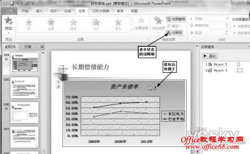 这样把多个演示内容集中在同一文档中,保存、管理都很方便。而且只要改一张幻灯片,在所有放映方案中用到的这张幻灯片内容都会同时改变,万一出错要修改幻灯片也可省事不少。 三、动画刷轻松重复动画设置 演示文档中总会有很多对象需要设置相同的动画,实际操作中我们不得不大量重复相同的动画设置。PPT2010中新增的动画刷可以把选中对象的动画设置复制到任意多个对象上。 PPT2010中我们只要先选中已经设置了动画的对象,例:收支曲线,在“动画”选项卡的“高级动画”区域双击“动画刷”使其处于选中状态,此时鼠标光标后会出现刷子。现在单击一下要设置的对象,例:负债率曲线(图3),即可让负债率曲线具有与收支曲线完全相同的动画效果。单击刷一个对象后,会有一段时间预览,此时鼠标后虽然没有刷子但动画刷仍然有效,我们不用等预览完成即可继续单击刷下一个对象。全部刷完后在页面空白处双击或再单击一下动画刷即可停止动画刷功能。