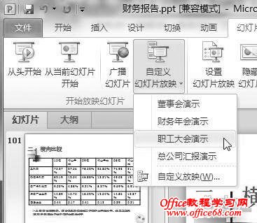 如果想要重复使用当前文档中的幻灯片,可以通过复制幻灯片实现。切换到所需幻灯片按下Ctrl+Shift+D快捷键即可把前幻灯片复制出另一份,然后在左侧幻灯片列表中把它拖动到需要位置即可。此外,你可以在左侧幻灯片列表中直接把所需幻灯片拖动到需要位置,先按住Ctrl键再放开鼠标左键即可把该幻灯片复制到指定位置。 二、多个演示合并制作 通常年终演示报告不会只做一份,我们需要针对不同的会议、不同的听众,分别制作多个演示。对此我们可以把多个演示的幻灯片全部集中在一个演示文档中制作。 1.定义放映方式 打开PPT2010先做一个包含所有幻灯片的总演示文档。切换到“幻灯片放映”选项卡,单击“自定义幻灯片放映”选择“自定义放映”,在“自定义放映”窗口中单击“新建”按钮。 当前文档中的幻灯片出现在“定义自定义放映”窗口的左侧列表中,你只要按播放顺序要求,逐一双击需要的幻灯片把它添加到右侧“在自定义放映的幻灯片”列表中即可,这列表就是我们要播放的幻灯片顺序。最后输入幻灯片放映名称为“职工大会演示”,单击“确定”把自定义的放映方案保存到“自定义放映”窗口列表中。 同样新建出“董事会演示”、“财务年会演示 ”、“总公司汇报演示”等各种放映方案。如果不满意已保存的放映方案,可在“自定义放映”窗口选中放映方案,单击“编辑”按钮重新修改。最后关闭“自定义放映”窗口,并命名保存总演示文档。 2.按自定义方案放映 要放映演示时,只要打开总演示文档,切换到“幻灯片放映”选项卡,单击“自定义幻灯片放映”即可在下拉列表中看到职工大会演示、董事会演示、财务年会演示、总公司汇报演示等自定义放映方案(图2),按需要选择一个方案即可按设置好的顺序放映幻灯片。此外,在放映中右击选择“自定义放映”也会显示自定义放映方案,你可以从中选择放映其他方案。
