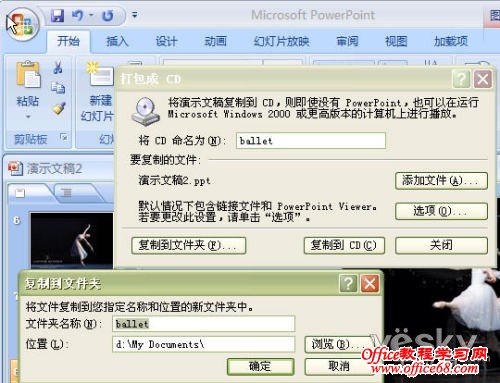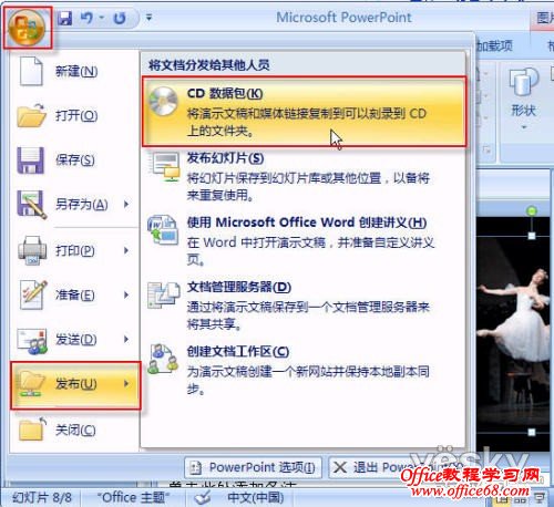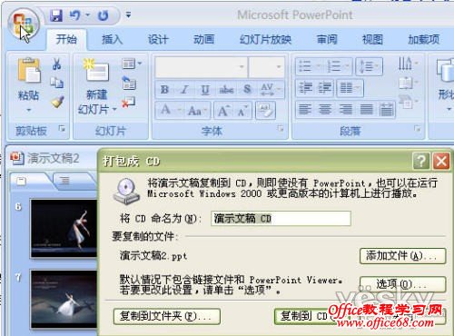 启动Powerpoint 2007,打开相应的演示文稿,单击“Office按钮”,在随后出现的快捷菜单中,依次选择“发布-CD数据包”选项,在随后弹出的对话框中,单击“确定”按钮。