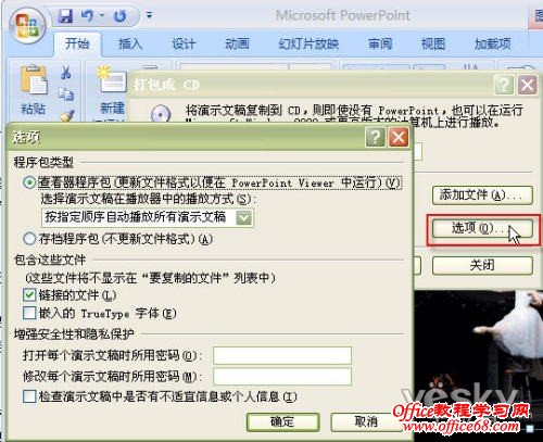 单击上述“确定”按钮后,打开“打包成CD”对话框,单击其中的“选项”按钮。