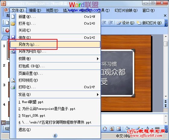 ①在PowerPoint中打开幻灯片,然后单击菜单栏的“文件”,选择“另存为”命令;
