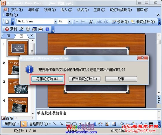③此时会弹出一个“想要导出演示文稿中的所有幻灯片还是只导出当前幻灯片?”选项(顾名思义啊,每张幻灯片就是将所有幻灯片转成JPG图片;仅当前就是当前一张幻灯片转成JPG图片)。