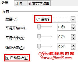 对于陀螺旋动画,设置较小的角度(案例选择了6度逆时针,因为矩形开始顺时针旋转了3度),并勾选”自动翻转”,设置好重复的次数.具体如下图: