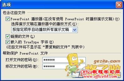 添加好幻灯片文件后点击“选项”按钮来设置一下播放的参数,在“选项”窗口中选择“PowerPoint播放器”,把“按指定顺序自动播放所有演示文稿”选中,这样就可以自动播放幻灯片了,再把“嵌入TrueType字体”和“链接的文件”也选中,如果你的幻灯片文件内容比较重要,那我们还可以来设置密码,保护光盘里面幻灯片文件的安全。设置好后点击界面上的“复制到CD”按钮就可以把这些幻灯片直接刻录到光盘上了(如图2)。