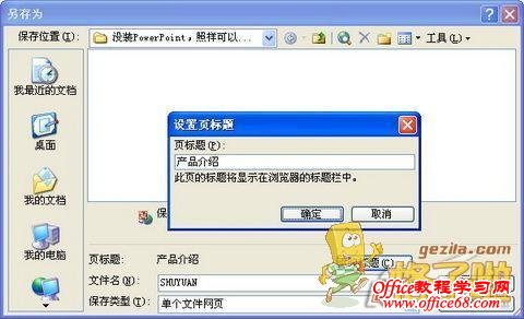 用PowerPoint打开要做成网页的幻灯片文件,接着点击菜单“文件-另存为网页”,在弹出的“另存为”窗口中点击“更改标题”按钮来改一下幻灯片在网页中的标题名称,在“保存类型”中选择“单个文件网页”,然后设置一下保存的文件名和保存目录,点击“保存”按钮,生成网页文件后,我们只要把它们上传到网上的空间就可以了(如图5)。
