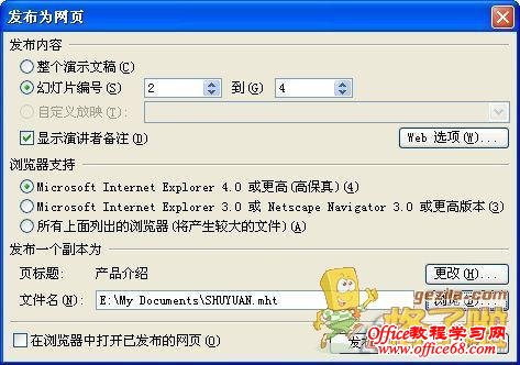 有时候我们只要保存整个幻灯片中的部分内容,那可以用PowerPoint打开要制作网页的幻灯片文件,接着点击菜单“文件-另存为网页”,在弹出的“另存为”窗口中点击“发布”按钮,弹出“发布为网页”窗口,选中“幻灯片编号”,在后面的选择框内输入幻灯片的起始编号和结束编号,如果需要显示备注的话,还要把“显示演讲者备注”选中,然后设置一下支持的浏览器版本,一般都是选择第一个“Microsoft Internet Explorer4.0或更高”,最后选择网页保存的目录,可以点击浏览按钮来选择,全部设置好后点击“发布”按钮就可以了(如图6)。
