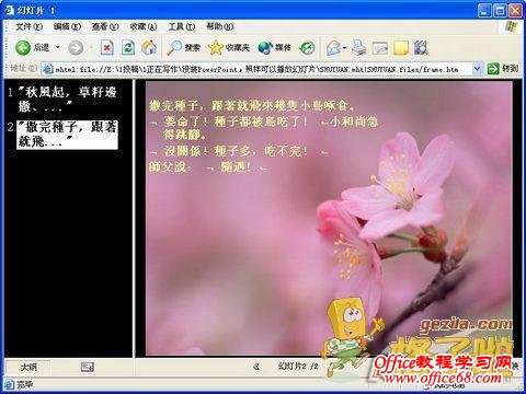 在生成的幻灯片网页中,双击里面的网页文件就可以看见效果了,点击网页右下角的“幻灯片放映”按钮,浏览器还可以以全屏的方式进行播放,效果和在PowerPoint2003播放差不多(如图7)。