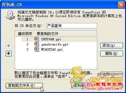 操作的方法和“打包到CD”的方法差不多,先点击菜单“文件-打包成CD”,在“打包成CD”窗口中选择一下要打包的幻灯片文件,接着点击“选项”按钮来进行一些基本设置,按住上面的设置也可以,设置好后我们点击“打包成CD”窗口上的“复制到文件夹”按钮(如图3)。