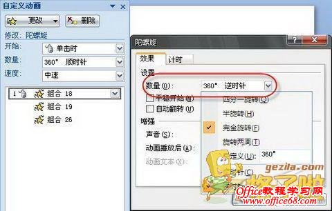 现在,分别选中动画任务中的一个,点击其右侧的下拉按钮,在弹出菜单中点击“效果选项”命令,打开“陀螺旋”对话框。点击“效果”选项卡,然后在“数量”后的下拉列表中选择“逆时针”或“顺时针”,如图6所示。再点击“计时”选项卡,在“速度”下拉列表中选择“慢速”、“中速”或“快速”等速度设置。在“重复”下拉列表中指定旋转重复的次数,也可以选择“直到下一次单击”或“直到幻灯片末尾”。