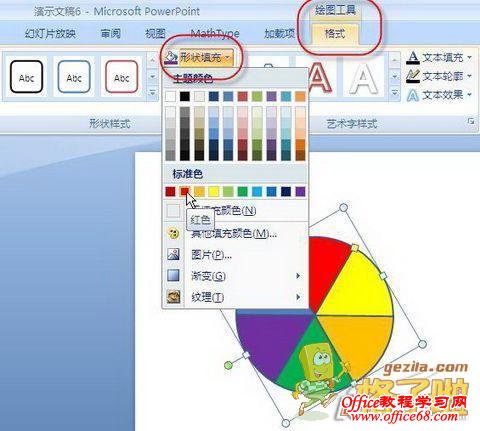 现在要做的,那就是选中一个扇形,然后点击功能区“绘图工具”下的“格式”选项卡“形状样式”功能组“形状填充”按钮旁边的小三角形,在弹出的菜单中为扇形指定颜色,如图4所示。其它几个扇形照此办理。