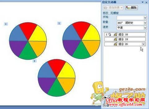 在任务窗格的左上角,点击“添加效果→强调→其他效果”命令,打开“添加强调效果”对话框,在“基本型”列表中点击“陀螺旋”,确定后就可以在任务窗格的动画任务列表了,如图5所示。三个任务的序号都是一样的。点击下方的“播放”按钮,可以看到三个风车都以相同的方向和速度进行旋转。转完360度之后就停止不转了。