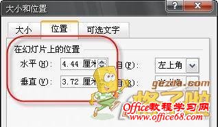 选中做好的扇形,在扇形上点击右键,在弹出的快捷菜单中点击“大小和位置”命令,打开“大小和位置”对话框。记住“位置”选项卡中“水平”和“垂直”输入框中的数据备用,如图3所示。