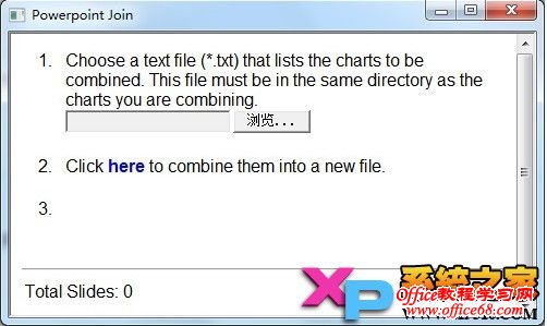将你刚刚下载的工具压缩文件解压,打开pptjoin.hta文件。选择上一步生成的文本文件,并点击按钮开始合并PPT。