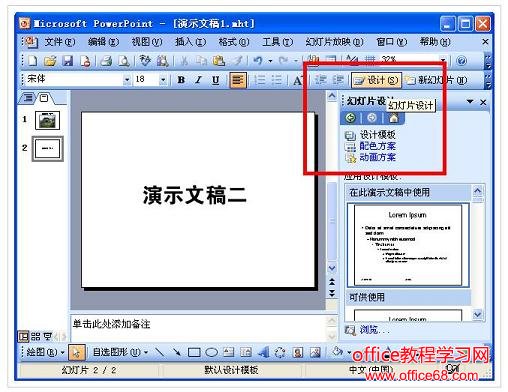 设计模板是包含演示文稿样式的文件, 包括项目符号和字体的类型和大小、占位符大小和位置、背景设计和填充、配色方案以及幻灯片母版和可选的标题母版。使用设计模板的目的是让不同的演示文稿共享样式。 应用设计模板 可以在创建演示文稿时应用设计模板,也可以在编辑演示文稿时应用设计模板,其具体步骤如下: 1)在“格式”工具栏上,单击“设计”。(如果已打开“幻灯片设计”窗格并显示有配色方案或动画方案,请单击顶部的“设计模板”。)