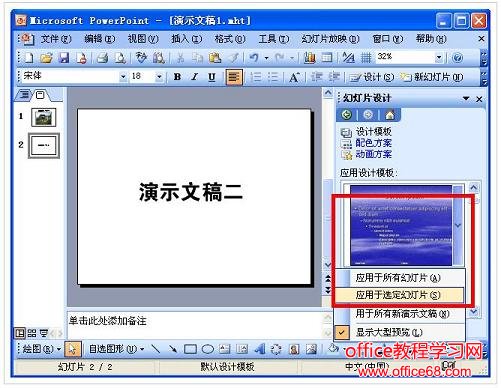 2)执行下列操作之一: 若要对所有幻灯片(和幻灯片母版)应用设计模板,请单击所需模板。 若要将模板应用于单个幻灯片,请选择“幻灯片”选项卡上的缩略图;在任务窗格中,指向模板并单击箭头,再单击“应用于选定幻灯片”。 要将模板应用于多个选中的幻灯片,请在“幻灯片”选项卡上选择缩略图,并在任务窗格中单击模板。 若要将新模板应用于当前使用其他模板的一组幻灯片,请在“幻灯片”选项卡上选择一个幻灯片;在任务窗格中,指向模板并单击箭头,再单击“应用于母版”。