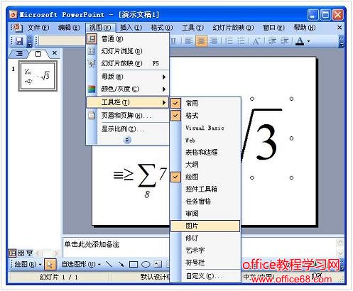 插入彩色的公式 默认情况下,插入的公式都是黑白的,影响演示效果,如何将其设置为彩色的呢? 1、执行“视图→工具栏→图片”命令,展开“图片”工具栏。