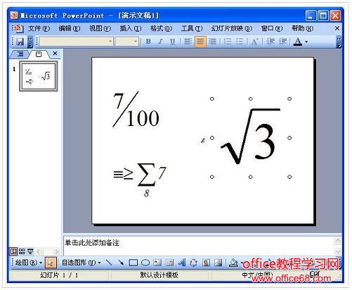 3、利用工具栏上的相应模板,即可制作出相应的公式。 4、编辑完成后,关闭“公式编辑器”窗口,返回幻类片编辑状态,公式即可插入到其中。