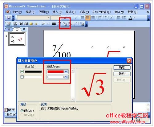 2、选中插入的公式,然后单击“图片重新着色”按钮,打开“图片重新着色”对话框。