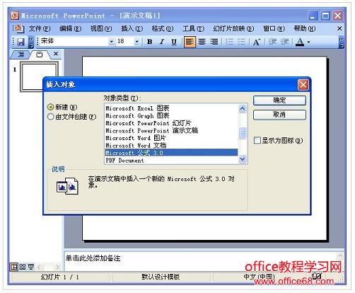 2、在“对象类型”下面选中“Microsoft 公式3.0”选项,确定进入“公式编辑器”状态下。 注意:默认情况下,“公式编辑器”不是Office 安装组件,在使用前需要通过安装程序进行添加后,才能正常使用。