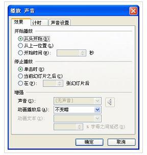 声音的更多设置: 你可以用右键点“声音”图标,之后在“自定义动画”中的“效果选项”中进行设置。在选项卡里,可以对声音的“效果”、“计时”、“声音设置”进行分别设计。