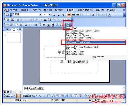2、单击工具栏上的“ 其他控件” 按钮,在随后弹出的下拉列表中选“ Shockwave Flash Object” 选项,然后在幻灯片中拖拉出一个矩形框(此为播放窗口)。
