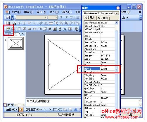 3、选中上述播放窗口,按工具栏上的“属性”按钮,打开“属性”对话框,在“ Movie”选项后面的方框中输入需要插入的Flash 动画文件名及完整路径,然后关闭属性窗口。