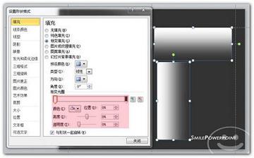 新建2个矩形框,选择渐变填充。颜色填充为PPT所使用的背景色,如本PPT使用背景色为白色。将渐变填充色的起始色不变,结尾的颜色透明度调至100%,具体如下图。