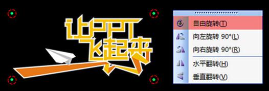 在PowerPoint 2003/2007/2010中,选定某个图形对象,在图形的上方会自动出现一个绿色的小圆圈,这就是用来控制旋转的控制点。把鼠标放到上面拖动,就可以旋转当前对象。但用这个控制点旋转时比较别扭,其实,我们可以选择自己喜欢的控制点。在PowerPoint 2003中,在图形工具栏中选择“绘图→旋转或翻转→自由旋转”命令,可以看到图形的四周出现了四个控制点,这样就可以选择合适的控制点了。