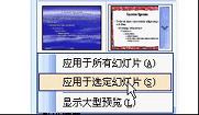图1 3.在“应用设计模板”中选择要应用到某一张幻灯片的模板,然后点击模板边出现的下拉箭头,选择“应用于选定幻灯片”即可,如图2所示。