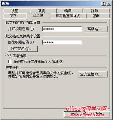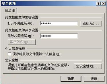 2、执行“文件→另存为”命令,打开“另存为”对话框,按对话框右上方的“工具”按钮,在随后弹出的下拉菜单中,选择“安全选项”选项,打开“安全选项”对话框(如图二),设置好相应选项的密码,“确定”返回,再取名保存即可。 图二