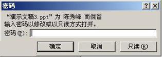 如果设置了“修改权限密码”,以后使用者在打开相应的演示文稿时,如果在如图四所示的对话框中输入正确的密码,不仅可以打开文稿,而且可以修改文稿,如果没有输入正确的密码,则可以通过按其中的“只读”按钮,将文稿打开播放,当不能对其进行修改。 图四