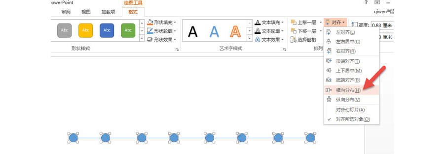 批量选中所有圆,在按住Ctrl键单击直线,取消选中直线,然后再“对齐—横向分布”