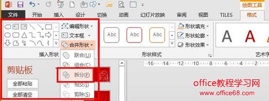 1. 3、选中所有图形,取消组合,让每个图形都各自独立。选择【绘图工具】-【格式】-【合并形状】-【拆分】命令,将图形进行拆分。