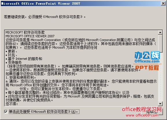 很多时候大家会发现,我们辛苦做出来的PPT拿到别的电脑有可能根本没法打开,更别说什么播放效果了。虽然很着急,但也需要先分析一下,没法打开PPT的原因有很多,其中一种就是对方电脑上根本没安装PowerPoint软件,这时候我们可以试试PPT阅读器。 微软出品的PowerPoint Viewer 2007是一款小巧实用的PPT阅读器,不仅容易安装,而且操作简单,易于使用,在不安装PowerPoint软件的情况下也可以播放PPT、PPTX、PPTM、PPS、PPSX、PPSM、POT、POTX、POTM等各种格式的PPT文件,但无法对它们进行编辑和修改。 我们可以点击后面的下载链接下载这款PPT阅读器,然后双击下载下来的EXE文件开始安装,接受条款后根据提示安装软件,直到安装完成。
