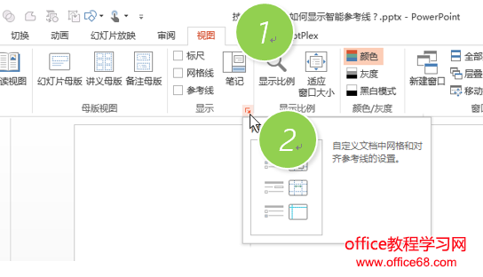 默认PPT软件都会显示“形状对齐显示智能向导”,当然如果你也让虚线不显示。此问题就是牛BQ群里的小伙伴使用PPT时发现虚线没有了,在Q群提出了该问题并解决。因为不显示虚线,将严重影响PPT图形绘制的效率,所以我们才发布了这个PPT技巧。 打开或关闭“形状对齐显示智能向导”的方法很简单,操作步骤如下: 在“视图”选项卡中打开“显示”组的右下角对话框按钮。如下图2显示。