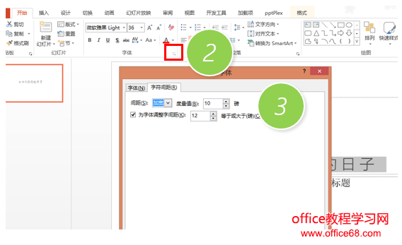 接下来把字体的间距批量设置宽。 单击“字体”组的对话框启动器,(下图红色处:2处),切换至字体的字符间距界面。并设置间距的度量值为10磅。(下图3处)