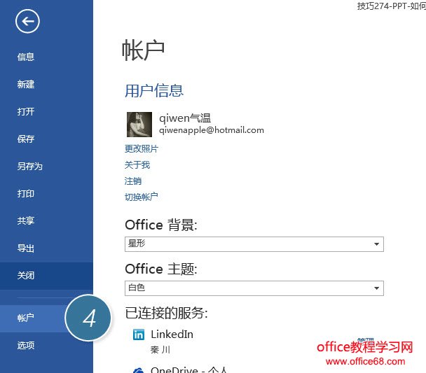 总结: PPT的这个功能虽然非常强大的, 但也有需要注意的地方就是要成功演示,必须要有一个微软的MSN或Hotmail或live的账号,也就是微软的账号。必须提前登录到PPT2013上,也就是在任何下图的账户中需要登陆你的微软账号,这个功能才能分享成功哟。(下图 4 处)