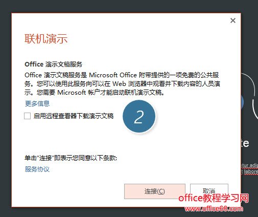 接下来在新弹窗口中,有个勾很重要(下图 2 处),如果打勾了则过会用浏览器观看PPT演示的人是可以下载演示文稿。这里的需求不能让大家下载,所以不打勾,接着点连接。
