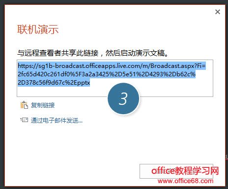 创建成功之后,PPT会自动给出一个链接地址,你只要把这个地址复制分享给需要看的人,比如发布到QQ,微信,或者通过电子邮件都可以。(下图 3 处)