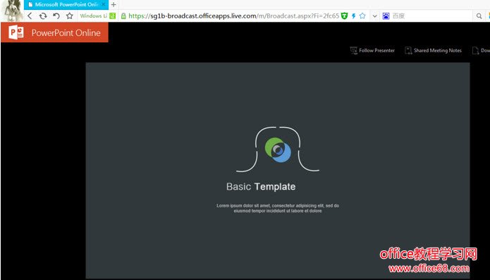 对方复制这条链接到浏览器就可以到你正在演示的PPT文稿,而且你演示到第几页,对方就看到第几页。下图就是对方通过那条链接看到的状态,是不是非常的酷呢,也就说他没有装Office软件,通过浏览器就可以看到你分享的PPT,这样非常方便与对方的交流,比如一遍打电话语音一遍让他看对应的页面。