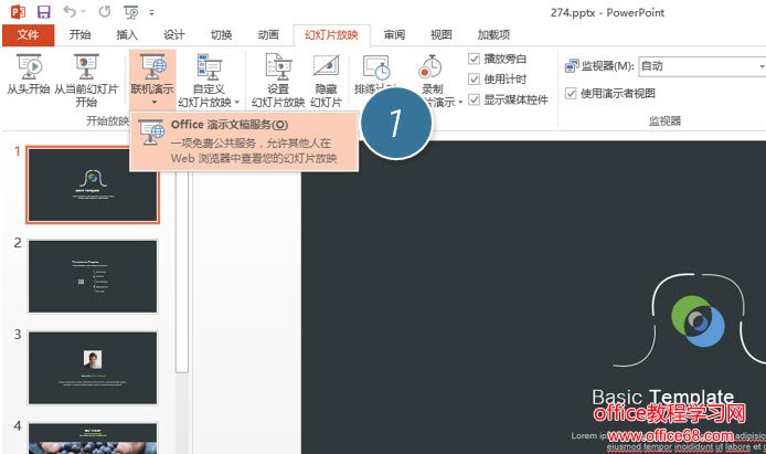 具体操作如下: 首先打开一个即将要演示的PPT文稿,单击“幻灯片放映-联机演示”按钮。如下图1处