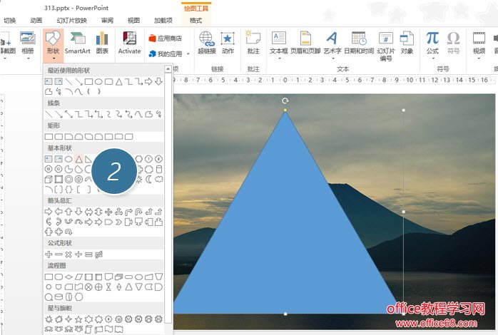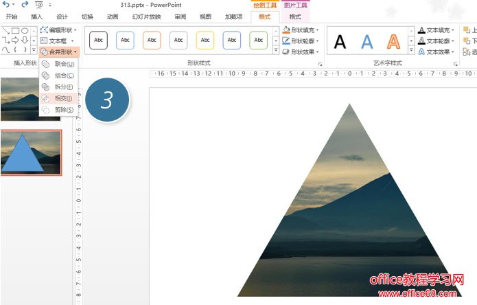 然后利用图形拆分功能,将图片切成三角形。注意先选中图片再选中三角形,然后利用“格式—合并形状—相交”。(下图 3 处)